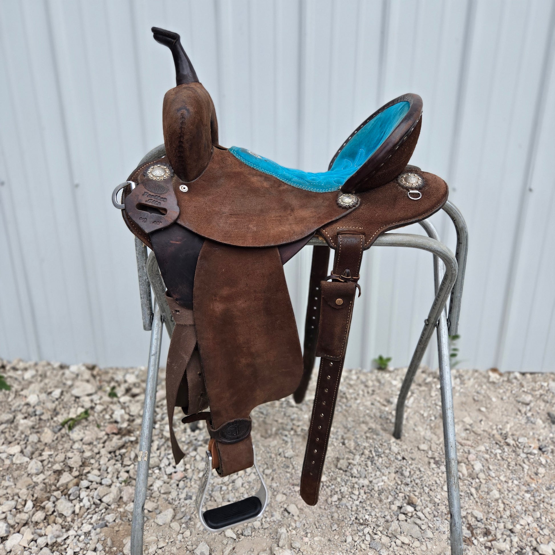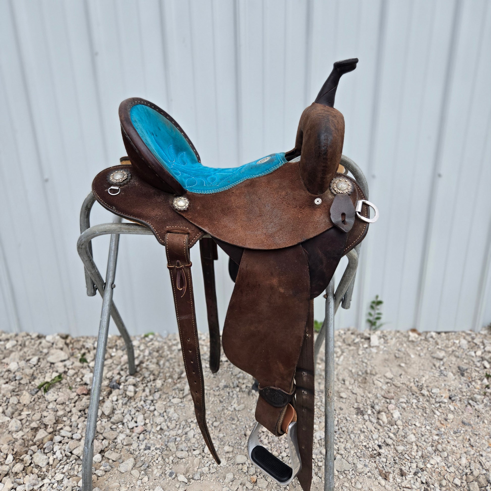 89171 is a 14.5" #10 X 40* (x-wide 40* bar with rock in the bar for a hip high horse) Feather Light barrel saddle made 3/2021.
