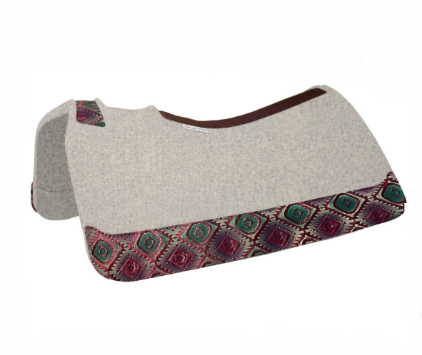 The All Around 5 Star Saddle Pad is our #1 Seller. It is a great pad for Barrel Racing, Trail Riding, and Roping as well as Smaller Skirted Saddles. The 100% pure virgin wool felt wicks away moisture, cleans up easily and stabilizes your saddle with limited cinching. Wear leathers provide protection and durability. Hand-made in the USA!