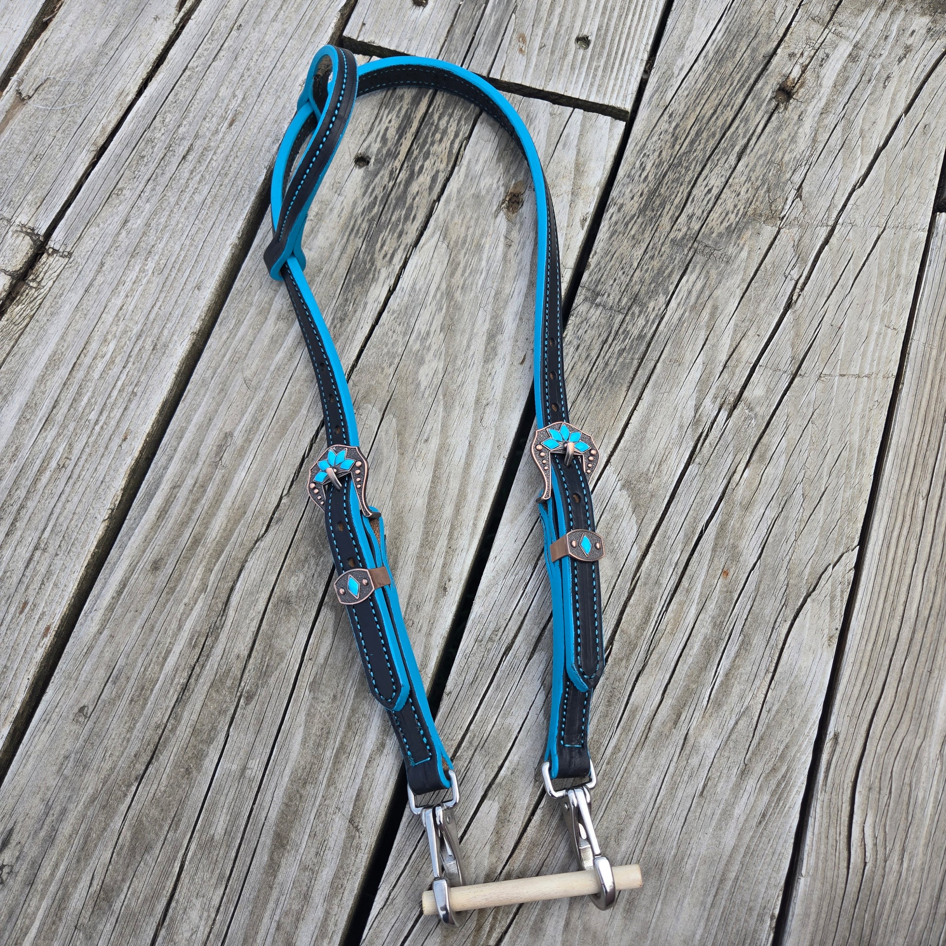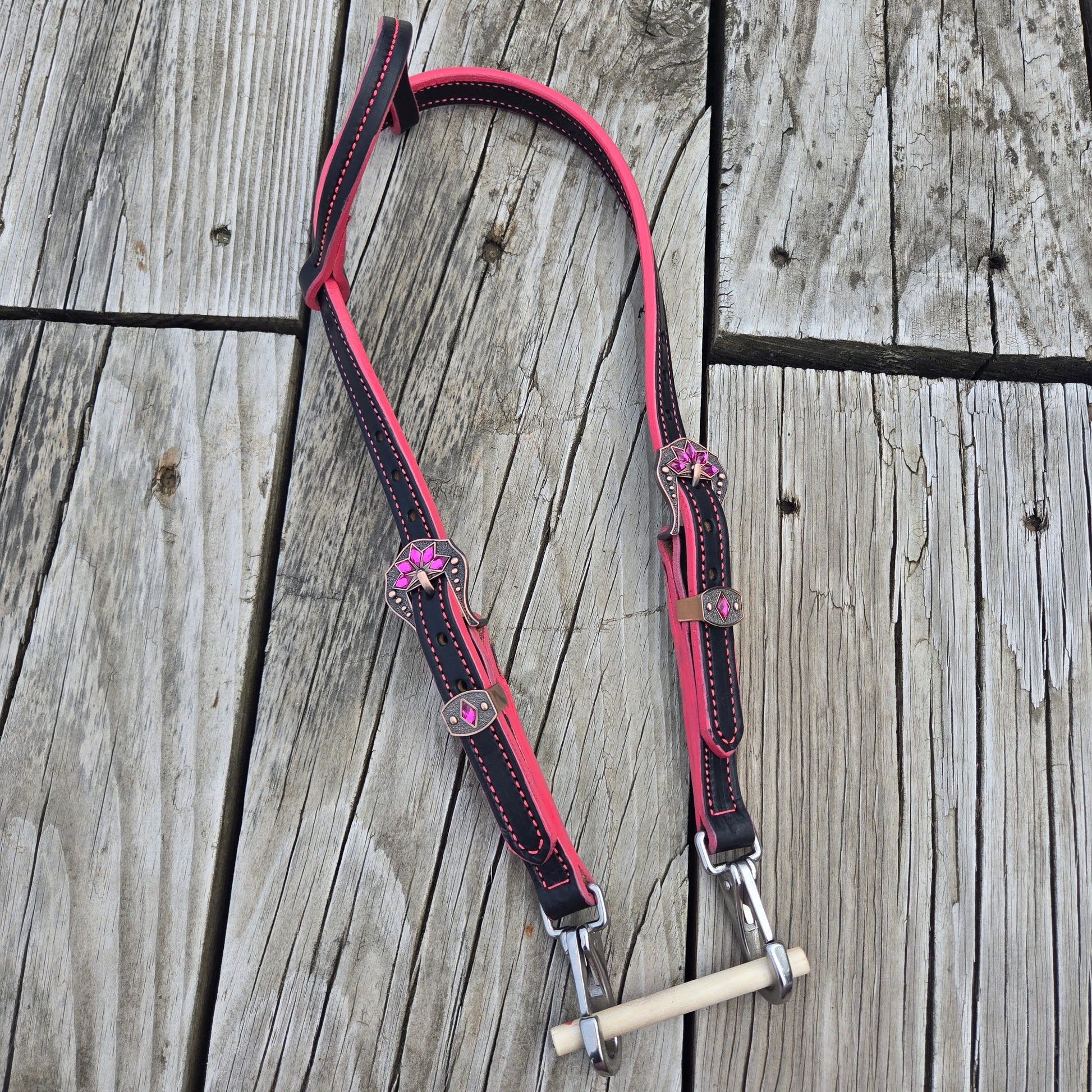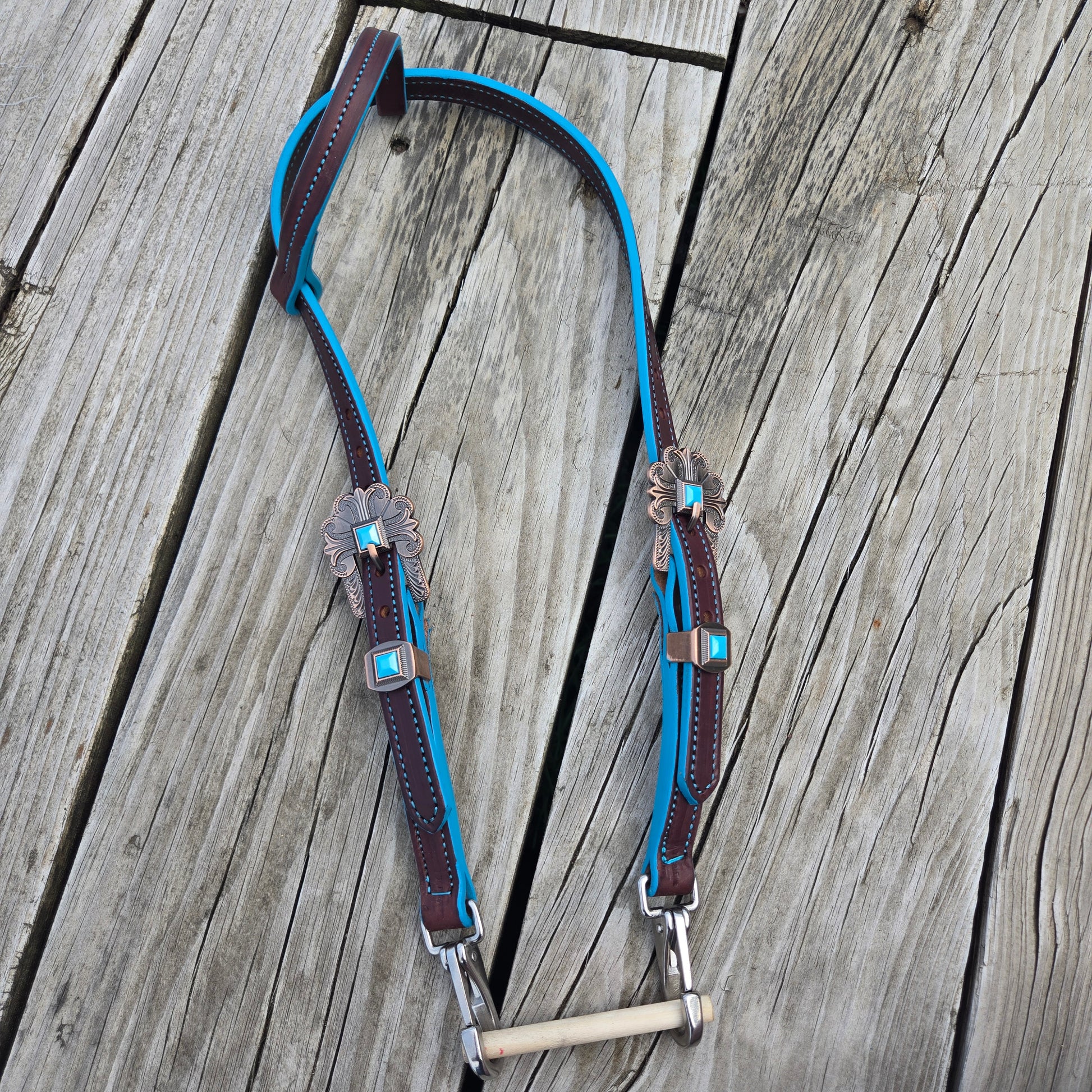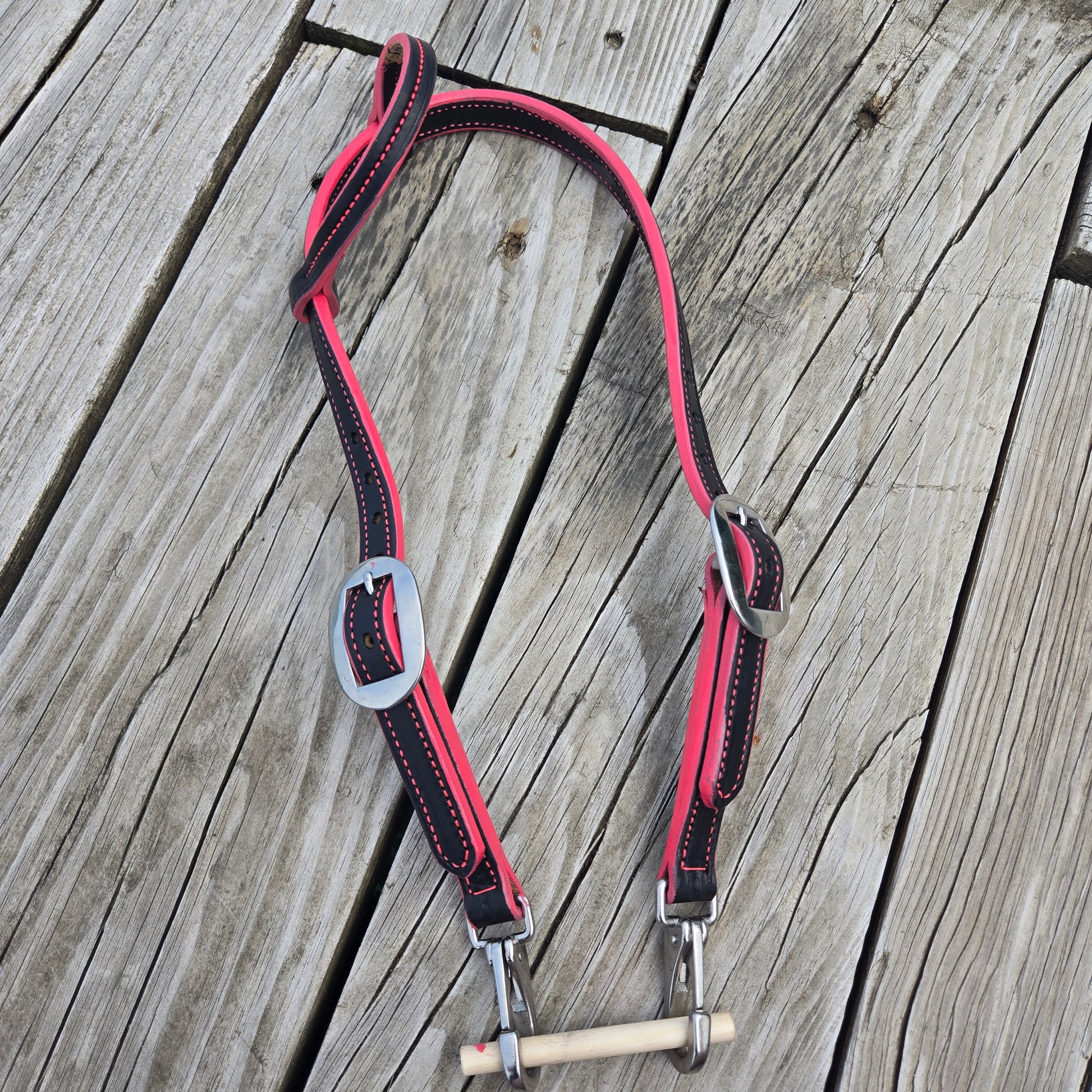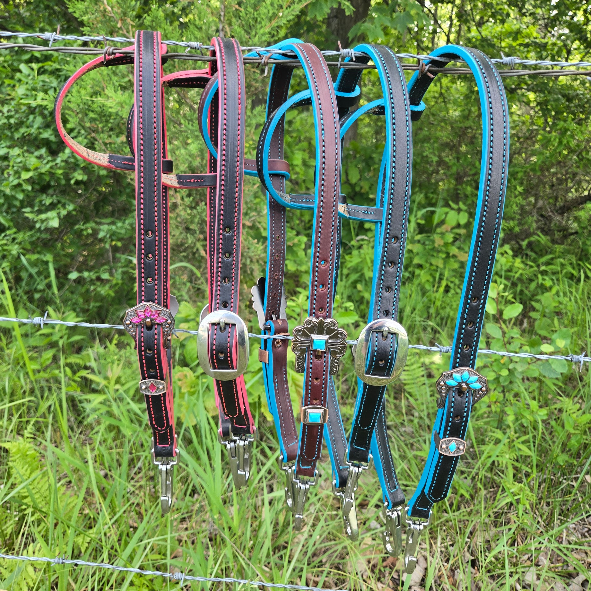 Fun, color edge one ear headstalls. Your choice of fancy or plain buckle. Stainless steel snap ends for each change. Made from grade 1 leather, conditioned for a great feel.