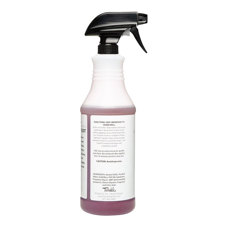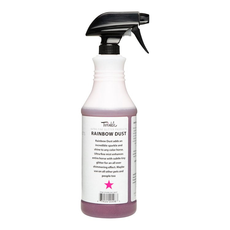 Twinkle Rainbow Dust adds an incredible sparkle and shine to any color horse. Ultra fine mist enhances entire horse with subtle tiny glitter for an all over shimmering effect. May be used on tack and clothing; great for people, too!