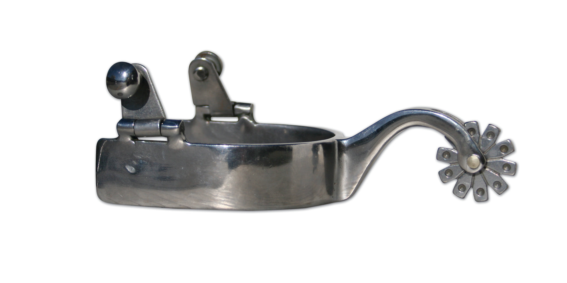 These polished steel spurs feature a unique curved shank that is 2 1/2" long and a stylish ten-point rowel with a decorative design.