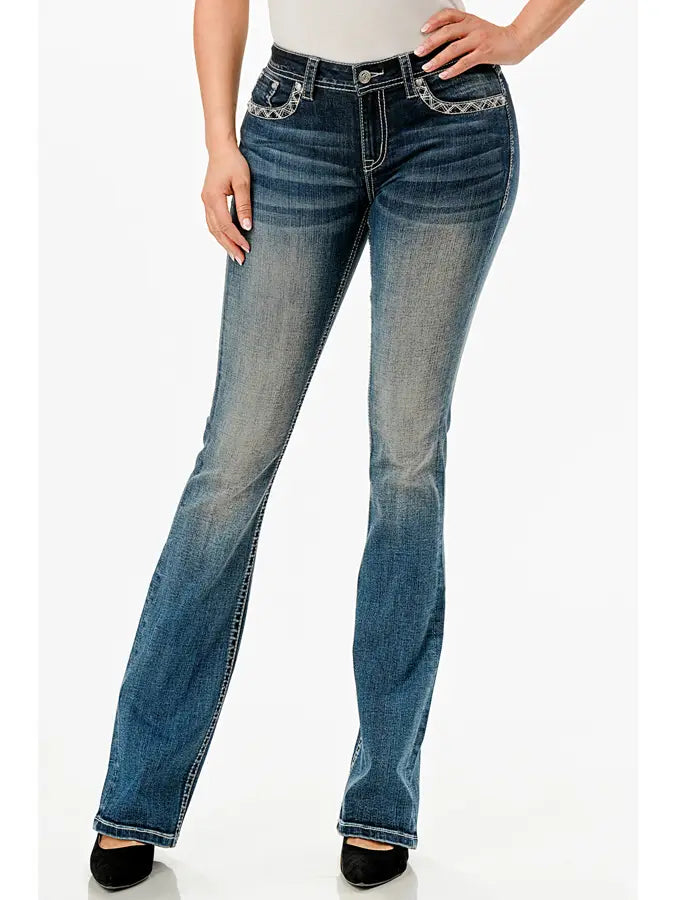 The grace in la women's bootcut jean in easy fit sits right at the waist to create a hip hugger feel on the hips and thighs. The jean is a steer head detailed with medium blue wash. They look like they’ve been yours forever, with details like distressing, sanding, and whiskering. So go ahead and make it official—your new bootcut jean is just a click away.