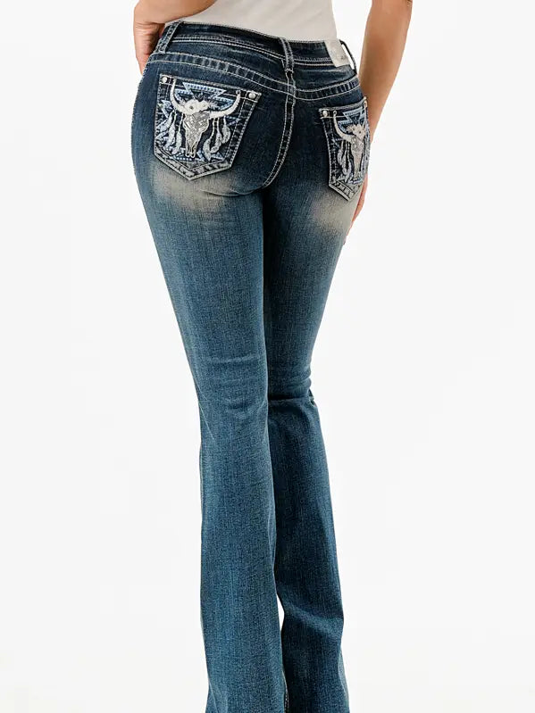 Grace In LA Floral Steer Head Aztec Mid-Rise Boot Cut 34"