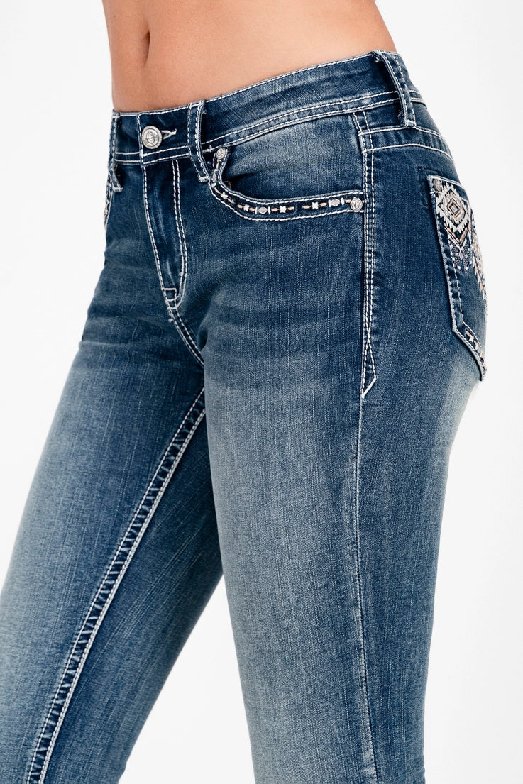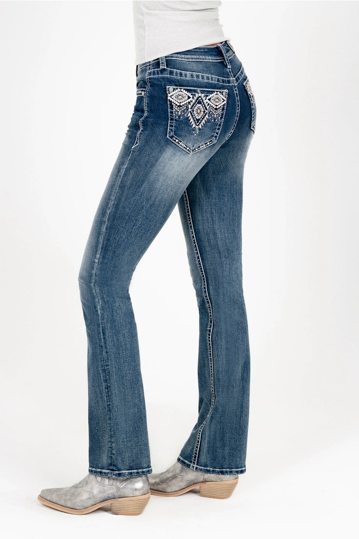 The grace in la women's bootcut jean in easy fit sits right at the waist to create a hip hugger feel on the hips and thighs. The jean is an aztec embroidery detailed with medium blue wash. They look like they’ve been yours forever, with details like distressing, sanding, and whiskering. So go ahead and make it official—your new bootcut jean is just a click away.