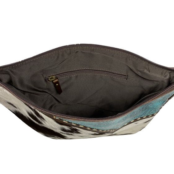 This classy cowhide purse is the perfect combination of vintage, western, and boho. This genuine hair-on cowhide leather bag is lightweight, spacious, and features a beautiful color combination of brown, white, and teal. Crossbody features a top zip closure, two zippered pockets on the back, one inside zipper pocket, and an adjustable shoulder strap. The distressed teal tooled leather patch and white backstitching on the front provides a striking contrast and fun flare to really make this bag stand out. This bag provides plenty of space and style making it the perfect accessory or gift.
