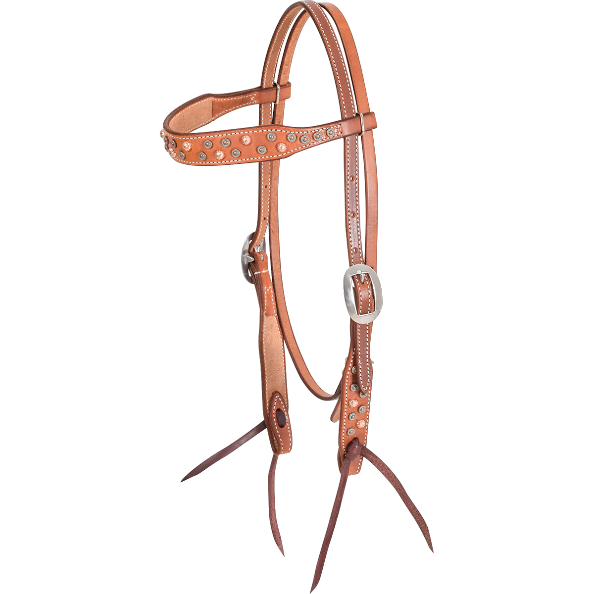 Natural skirting leather with copper parachute dots and antiqued dots. This headstall has cart buckles and bit ties.