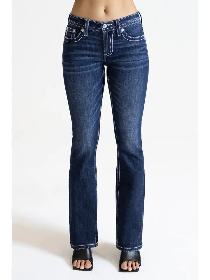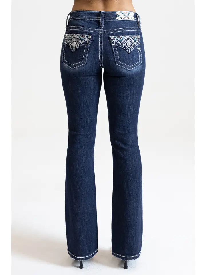 34" Inseam Mid-Rise Bootcut Denim in Dark Blue with Embroidered Pattern Pocket