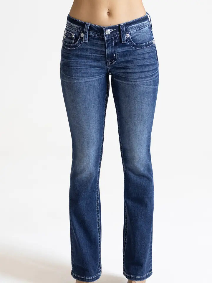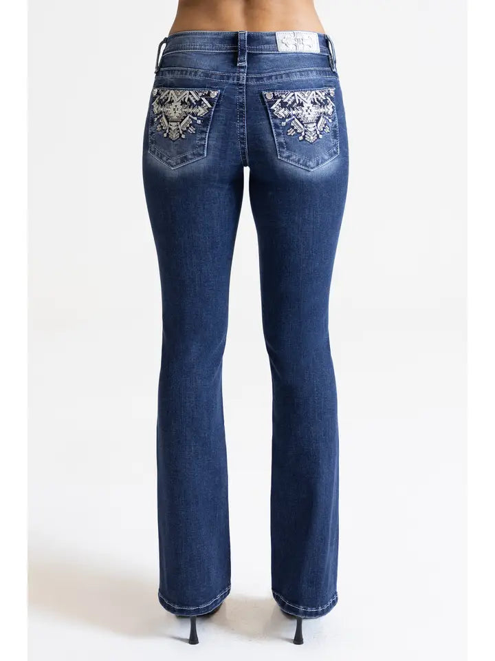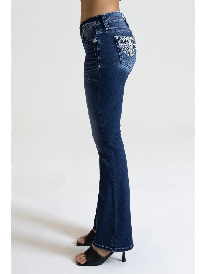 34" Inseam Mid-Rise Boot Denim in Dark Blue with Embroidered Americana Design Pocket