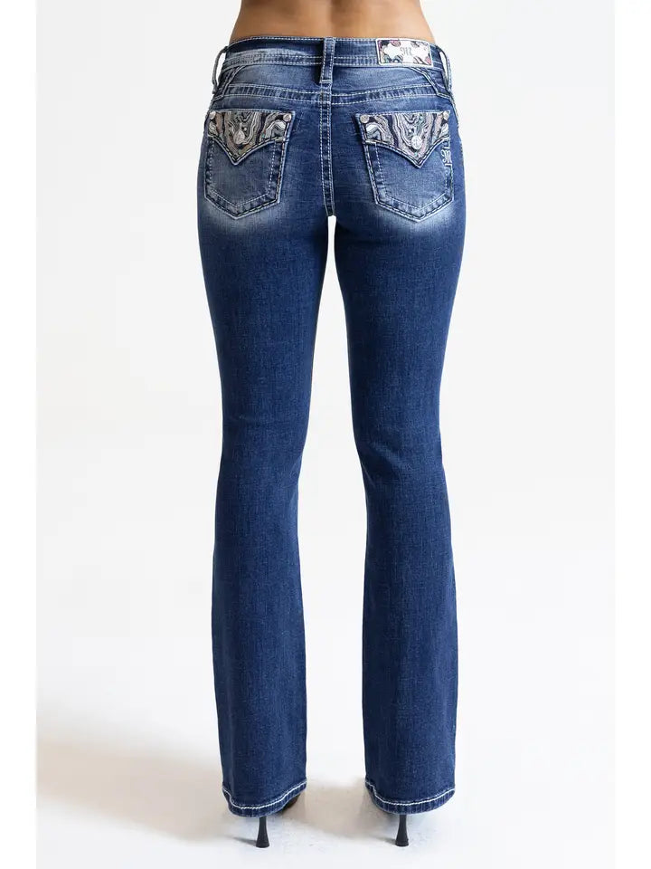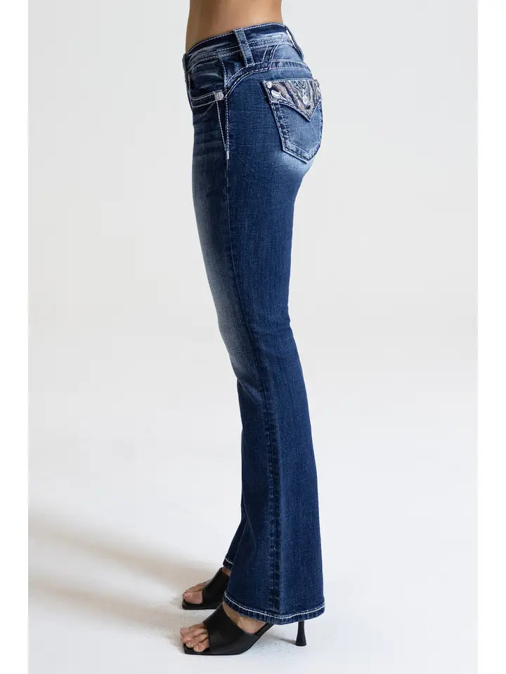 34" Mid-Rise Bootcut Denim in Blue with Embroidered Pattern Pocket
