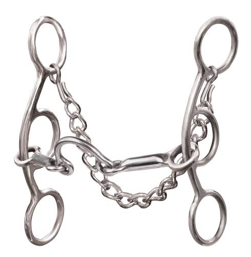 This is a good bit for the young horse who is ready to be transitioned from a snaffle to a shank bit. The short gag action allows the rider to pick up a horse when needed, allowing for greater control.