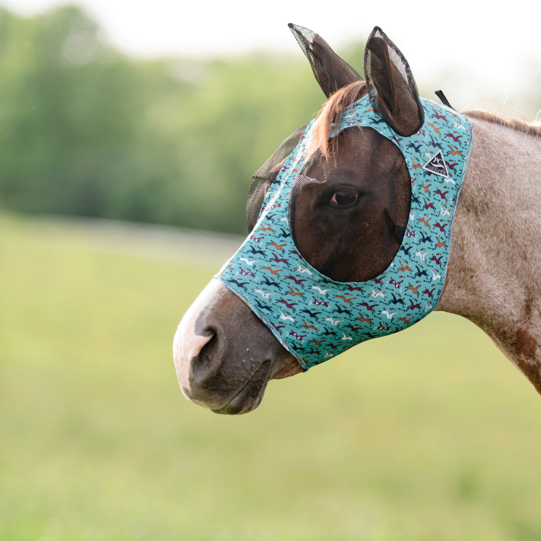 Designed with your horse’s comfort in mind! Smooth, stretchy lycra with binding around the edges fits your horse’s face like a glove. Mesh around the eyes and ears allows for clear vision and keeps flies and bugs away. Forelock opening for improved fit.