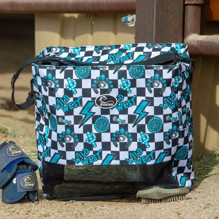 The Everything Equine tote bag is a multi purpose bag for all your equine needs. Available in 15 vibrant prints it's the perfect for carrying your grooming supplies or leg protection boots the mesh sides and bottoms lets dirt fall clear. The bag features 2 outside pockets big enough for your grooming product bottles or water bottles. The Everything equine bag is equipped with a zipper top to keep all your goods contained and a detachable shoulder straps for easy carrying and to attach to your stall front or trailer while grooming. Also makes a great beach bag, gym bag or pool bag!!!! Bag measures 16" across 15.5" tall and 6" wide