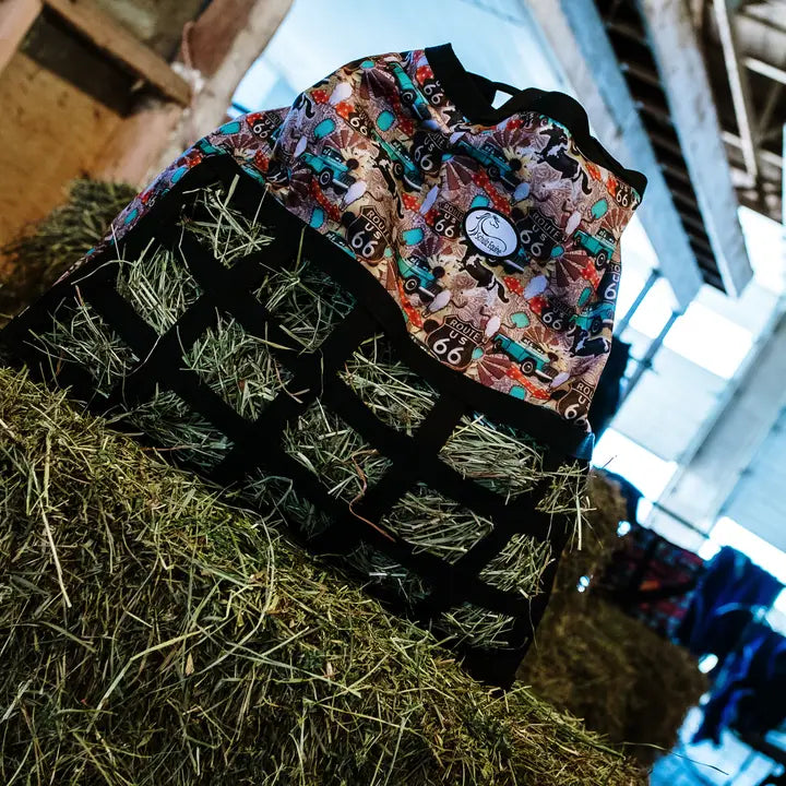Made from coated 600D nylon in 10 vibrant prints designed without any hardware, this medium feed hay bag is designed not to keep your trailer happy and free of scratches. easy top loading with a draw string closure with heavy duty rope. The medium feed size holes made of nylon webbing on front and back of bag