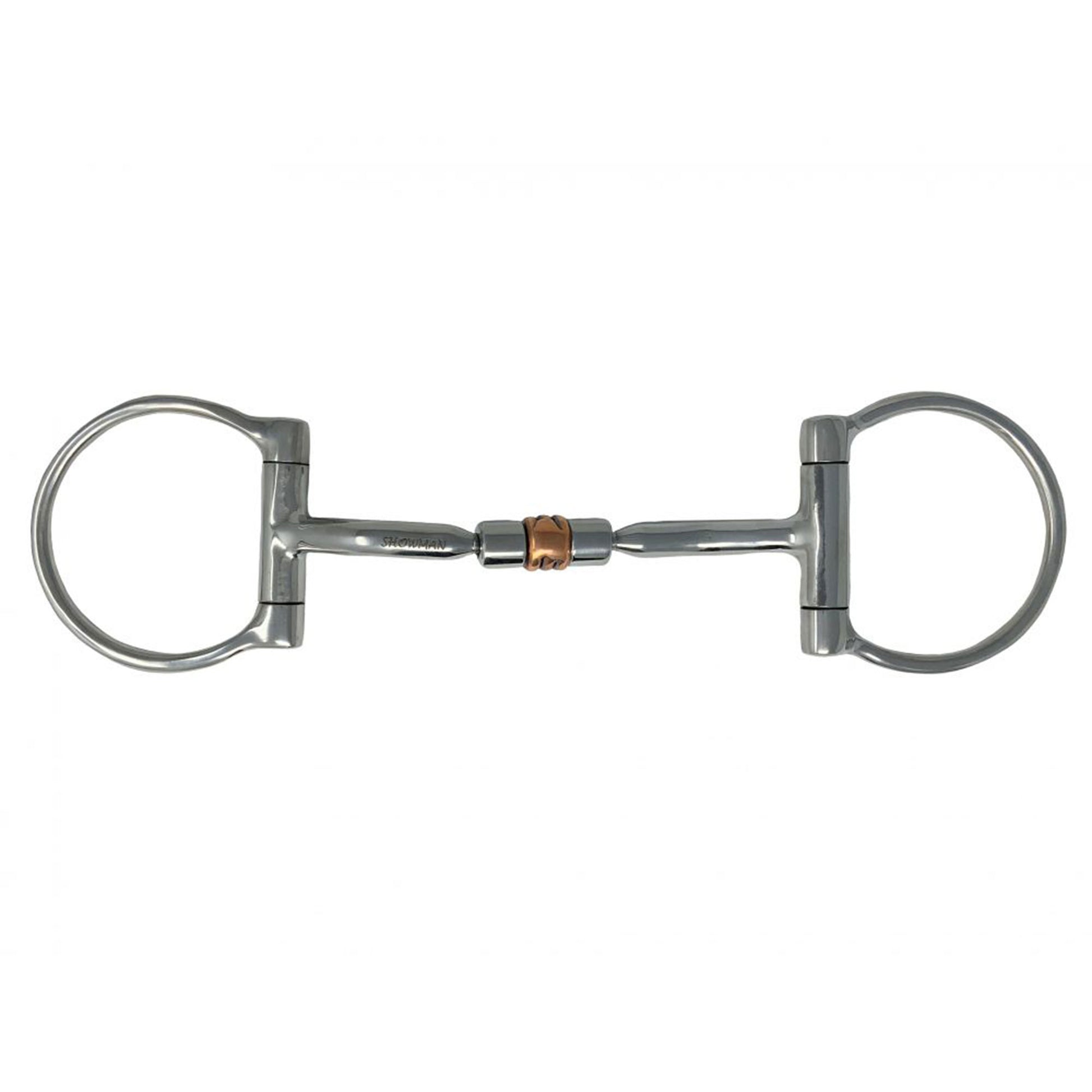 Showman ® Stainless Steel D-Ring bit with Copper Roller Center. This polished stainless steel d-ring features a 5" curved mouth with copper roller, with 3" Stainless Steel D-Ring cheeks.