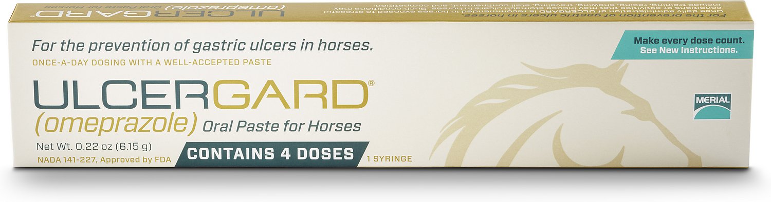Actively prevent stomach ulcers and the pain and discomfort that often accompanies them by giving your horse ULCERGARD during times of increased stress or exercise. ULCERGARD is the first and only proven non-prescription preventative for Equine Gastric Ulcer Syndrome. No other product is FDA-approved to prevent stomach ulcers in horses. Each tube of ULCERGARD contains four preventative doses for horses weighing between 600 and 1,200 pounds. Two doses are recommended for horses weighing more than 1,200 pounds.